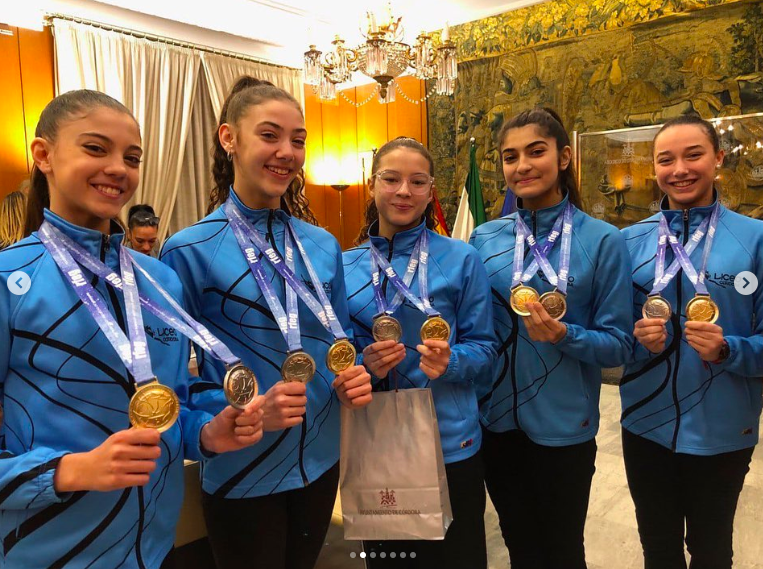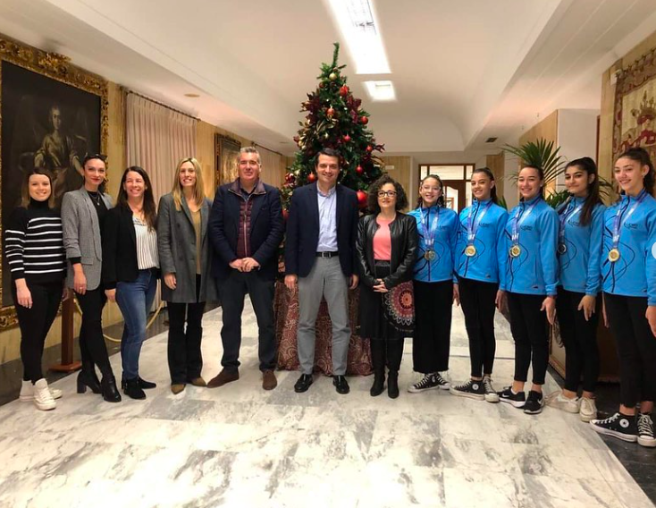 Las recientes campeonas de España por aparatos del circuito absoluto, Natalia Moreno, Lola Ruiz, Naiala Pedroza, Desiree Rodríguez y Ayse Akgun, junto con el equipo técnico Monica Sánchez, Lola Ruano, Laura Carrillo, Aurora Colmenero y la Presidenta del Club Marisol Lozano han recibido de mano del Excmo. Sr. Alcalde la enhorabuena por el éxito conseguido. En un ambiente distendido hemos charlado acerca del pasado, presente y futuro de nuestra entidad y sus gimnastas.